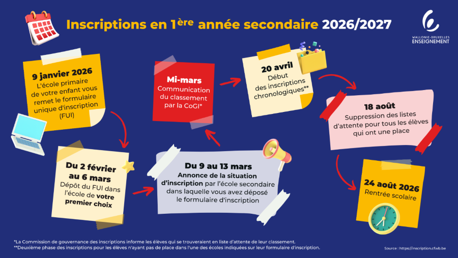 Les inscriptions en 1re secondaire se déroulent du lundi 2 février au 6 mars 2026 inclus, selon le calendrier officiel de la CFWB.